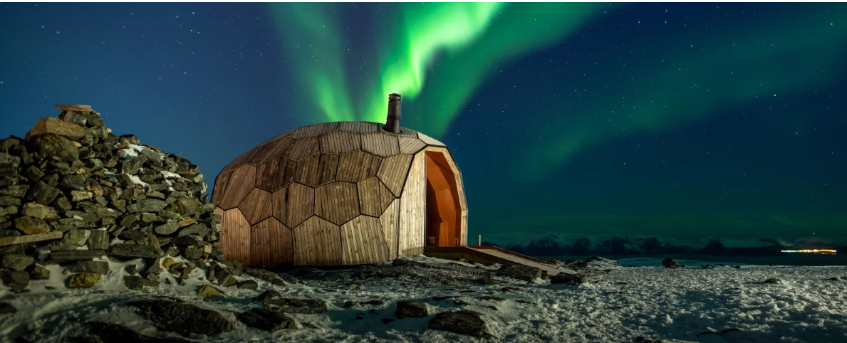Norveç’teki bu küçük dağ kabini, Kuzey Kutup Dairesi’ne seyahat eden yürüyüşçülerin ısınma ve barınma ihtiyacını karşılıyor. Proje, Hammerfest kasabasında yürüyüş yapmayı teşvik etmek için tasarlanmış iki ısınma kulübesinden ilki. Proje için bilgi, alçak bir dağ zirvesini çevreleyen manzarayla bütünleşen küçük bir dağ evi olarak verildi. Kabin; bir odun sobası, sade bir oturma alanı ve kutup arazisinin manzarasını içeriyor.